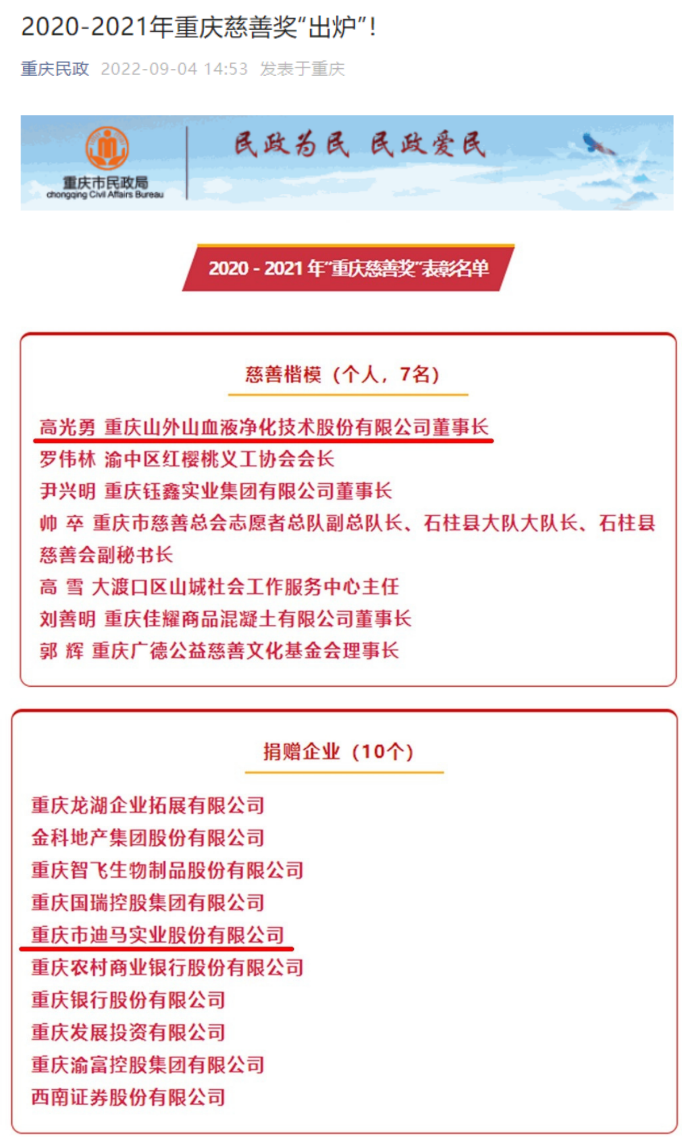 为表彰先进,树立典型,进一步激发全社会参与慈善、践行慈善的热情,经逐级推荐、评委评审、征求有关部门意见、社会公示等程序,9月4日,市人力社保局、市民政局决定对在2020年至2021年期间,为我市慈善事业发展作出突出贡献的企业、个人、慈善组织和优秀慈善项目(慈善信托)予以表彰。其中,9428cn太阳集团古天乐91级机械制造专业校友、重庆山外山血液净化技术股份有限公司董事长高光勇,校友企业——重庆市迪马实业股份有限公司获此殊荣。