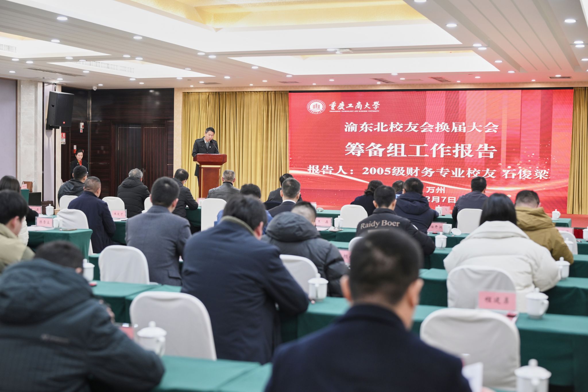 渝东北校友会换届大会筹备组代表石俊梁校友作筹备组工作报告。