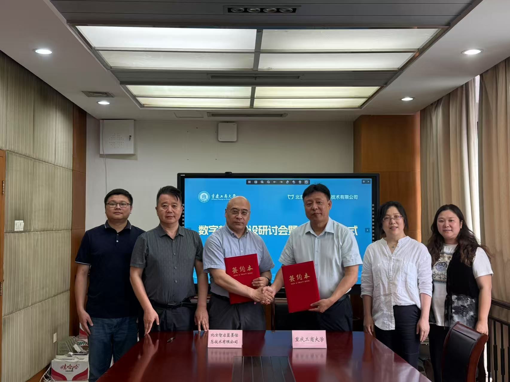 近日,重庆工商大学与北京智启蓝墨信息技术有限公司联合举办了数字教材建设研讨会及战略合作签约仪式。学校党委常委、副校长杨柏,教务处副处长韦晓兰,北京智启蓝墨信息技术有限公司董事长靳新及相关人员共同出席活动。此次合作旨在深入贯彻全国及全市教育大会精神,加速教材数字化转型,推动信息技术与教育教学深度融合,为高等教育的数字化发展注入新动力。