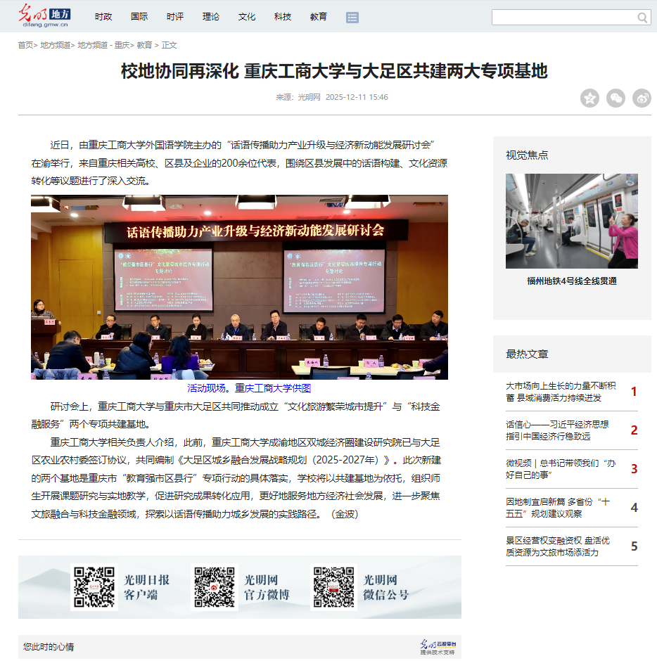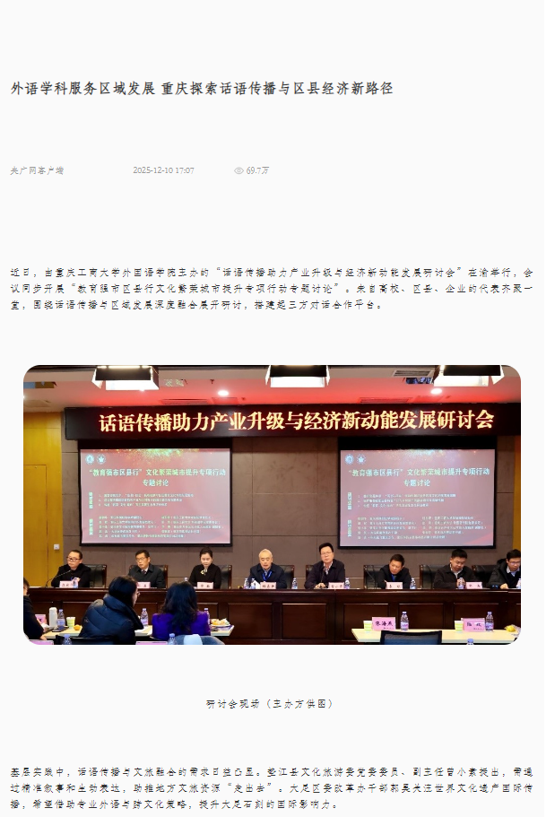 “光明网”以“校地协同再深化 重庆工商大学与大足区共建两大专项基地”为题,“央广网”以“外语学科服务区域发展 重庆探索话语传播与区县经济新路径”为题,“中央广电总台国际在线”以“重庆:话语传播助力产业升级与经济新动能发展研讨会举行”为题,“中国新闻网”以“话语传播如何驱动产业新动能?重庆这场研讨会给出了答案”为题予以了关注报道。截至目前,相关报道的阅读量已超过91.1万人次。