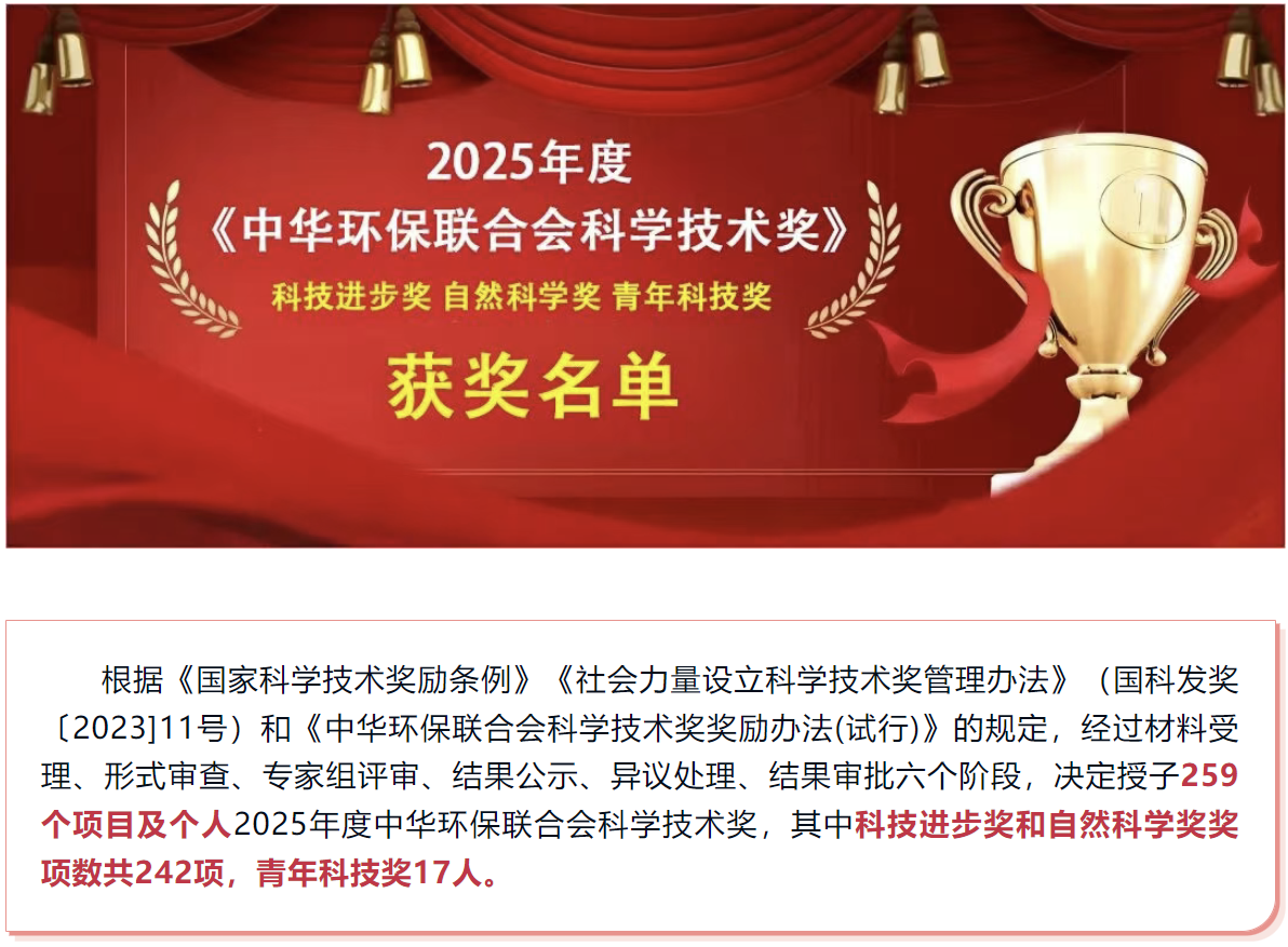 中华环保联合会科学技术奖是经国家科学技术奖励办公室和科技部正式备案的全国性权威奖项,是全国生态环境保护领域最具影响力的科技奖项,旨在表彰和奖励在生态环境保护及相关技术服务领域作出突出贡献的单位和个人。