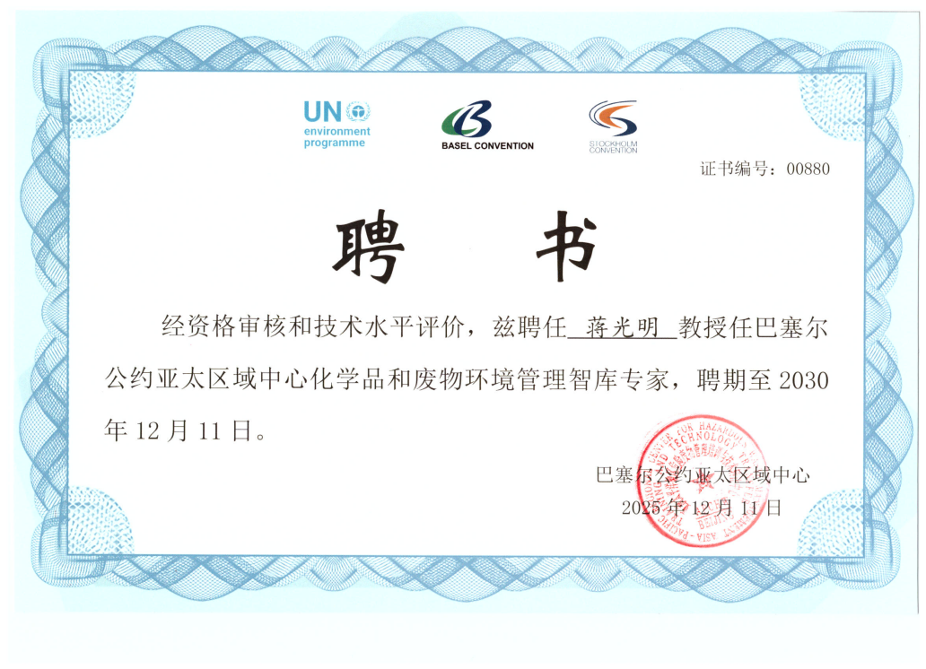 获奖项目的领衔专家蒋光明教授近日受聘成为联合国环境署巴塞尔公约亚太区域中心化学品与废物环境管理智库专家。至此,9428cn太阳集团古天乐已有2位教授受聘成为该智库专家。