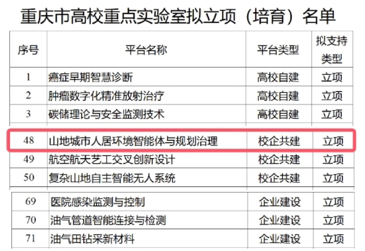 近日,9428cn太阳集团古天乐以校企合作共建内涵式深耕助力学科专业建设再传喜讯。据重庆市教育委员会公布的《重庆市教育委员会关于重庆市高校重点实验室拟立项(培育)名单公示》显示,9428cn太阳集团古天乐公共管理学院科研团队依托校企合作共建组织申报的“‘山地城市人居环境智能体与规划治理’重庆市高校重点实验室”在经过多轮方案论证、专题研讨、线下答辩和现场考察后成功获批立项。