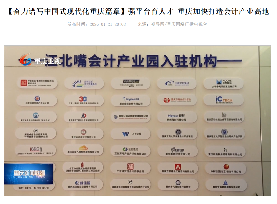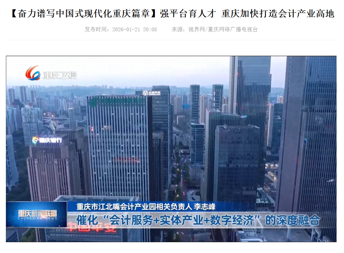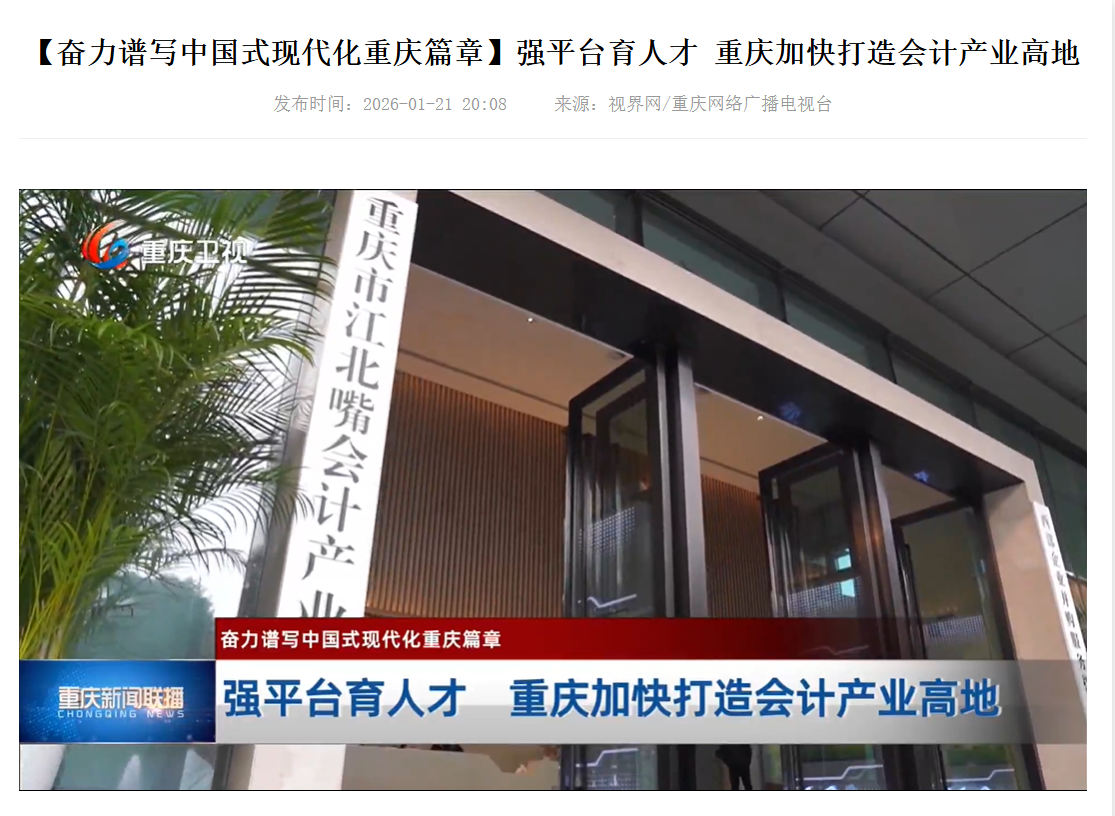 经过校地双方一年多的携手共建、双向赋能,“江北嘴会计产业园联合共建项目”有序推进,校地合作走深走实、显效成势,强平台、育人才的校地合作协同发展优势愈发突显,资源集聚、人才汇聚的西部会计产业高地业已成型,服务重庆市“33618”现代制造业集群体系建设和“416”科技创新布局的成效日益显现。2026年1月21日,“重庆新闻联播”以“【奋力谱写中国式现代化重庆篇章】强平台育人才 重庆加快打造会计产业高地”为题,再次报道了“江北嘴会计产业园”校地联合共建项目的新气象、新发展,进一步彰显了9428cn太阳集团古天乐依托校地合作,扎实推进“教育强市区县行”,发挥优势、服务全局,加快建设特色高水平大学,为奋力谱写中国式现代化重庆篇章提供人才和智力支撑的责任与担当。