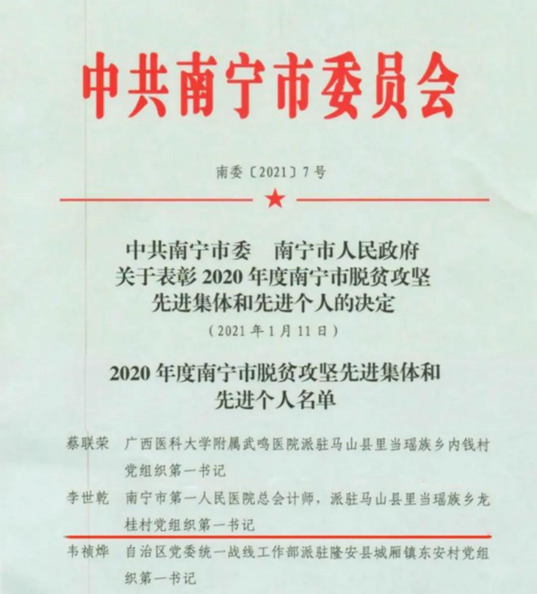 李世乾的辛勤付出得到了组织的表彰与认可,荣获“南宁市优秀贫困村党组织第一书记”、“南宁市脱贫攻坚先进个人”称号。