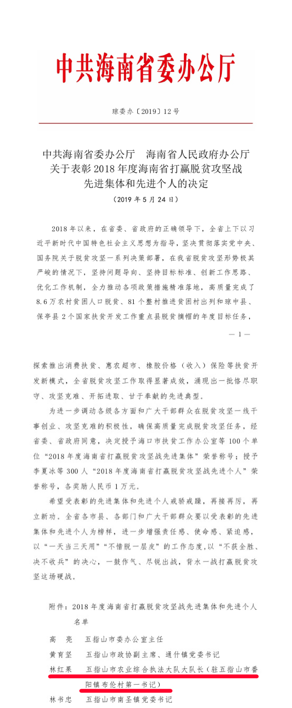 林红果2017年3月至2019年9月由海南省五指山市农业局派驻海南省五指山市番阳镇布伦村担任驻村第一书记,2019年9月转任海南省五指山市番阳镇布伦村脱贫攻坚战斗中队中队长。林红果2017年3月至今一直奋斗在脱贫攻坚一线,为国家的脱贫攻坚工作贡献力量。