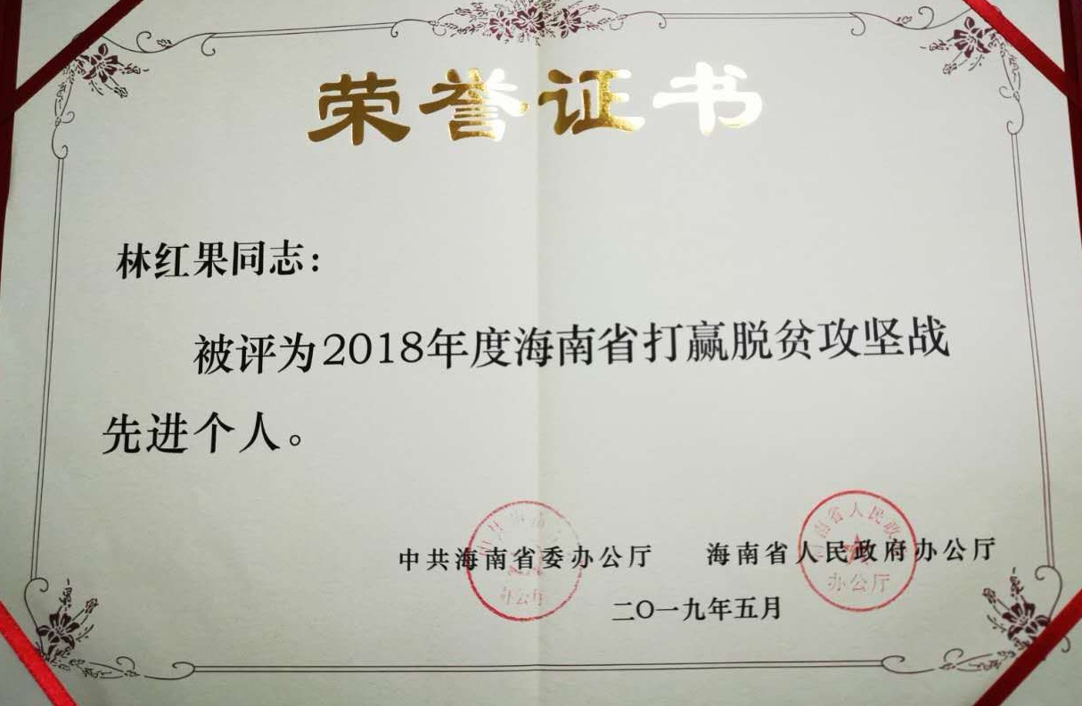 林红果驻村以来,群众满意度和获得感不断提高。他也得到了群众和组织的肯定,先后荣获“海南省五指山市优秀驻村第一书记”、“海南省五指山市第二届五指山好人敬业奉献奖”、“海南省打赢脱贫攻坚战先进个人”、“海南省五指山市优秀脱贫攻坚战斗中队中队长”等荣誉称号。