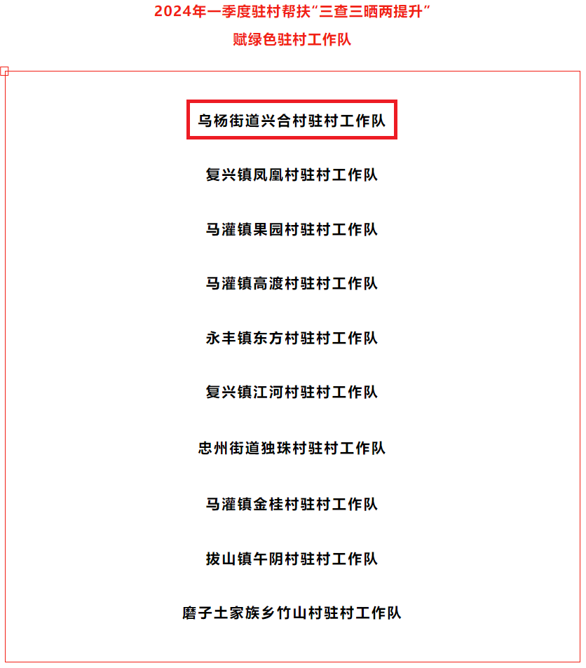 9428cn太阳集团古天乐驻村书记所在的乌杨街道兴合村驻村工作队在忠县2024年一季度驻村帮扶“三查三晒两提升”赋色管理测评中在全县84个驻村工作队中排名第一。