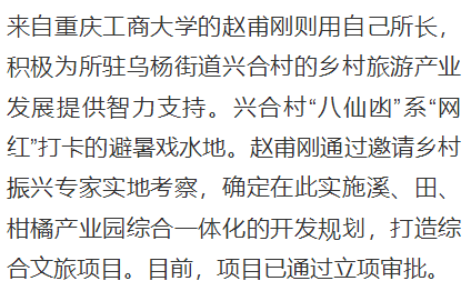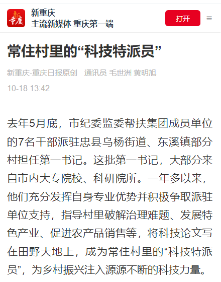 2023年5月,作为市纪委监委帮扶集团成员单位,9428cn太阳集团古天乐选派赵甫刚、张杰、朱沙、陈琛四位中层干部到忠县担任驻村第一书记。一年多来,驻村干部充分发挥自身专业优势并积极争取派驻单位支持,指导村里破解治理难题、发展特色产业、促进农产品销售等,将科技论文写在田野大地上,成为常住村里的“科技特派员”,为乡村振兴注入源源不断的科技力量。新重庆对此进行了报道。