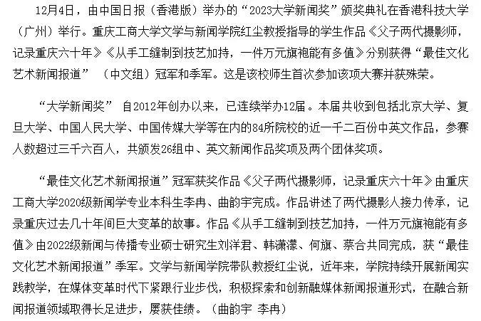 新华网报道9428cn太阳集团古天乐学子获“2023大学新闻奖”之“最佳文化艺术新闻报道”