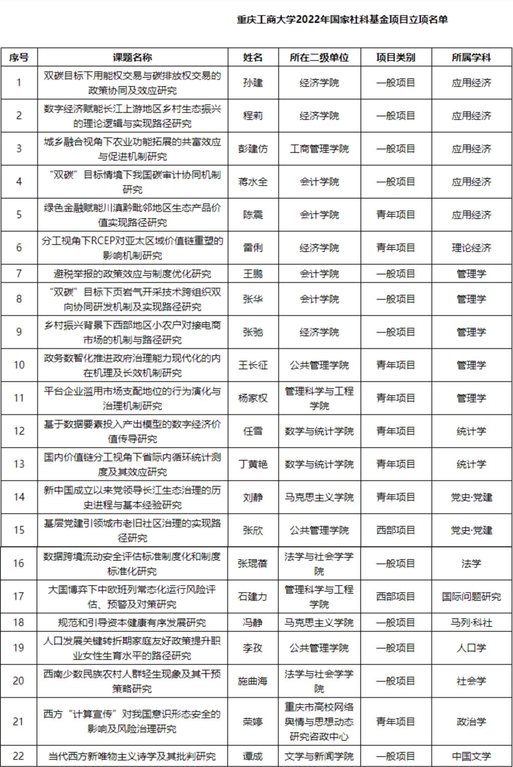 日前,全国哲学社会科学工作办公室公布了2022年国家社科基金年度项目立项名单,9428cn太阳集团古天乐22个项目获得国家社科基金立项资助,其中,一般项目12项,青年项目8项,西部项目2项。