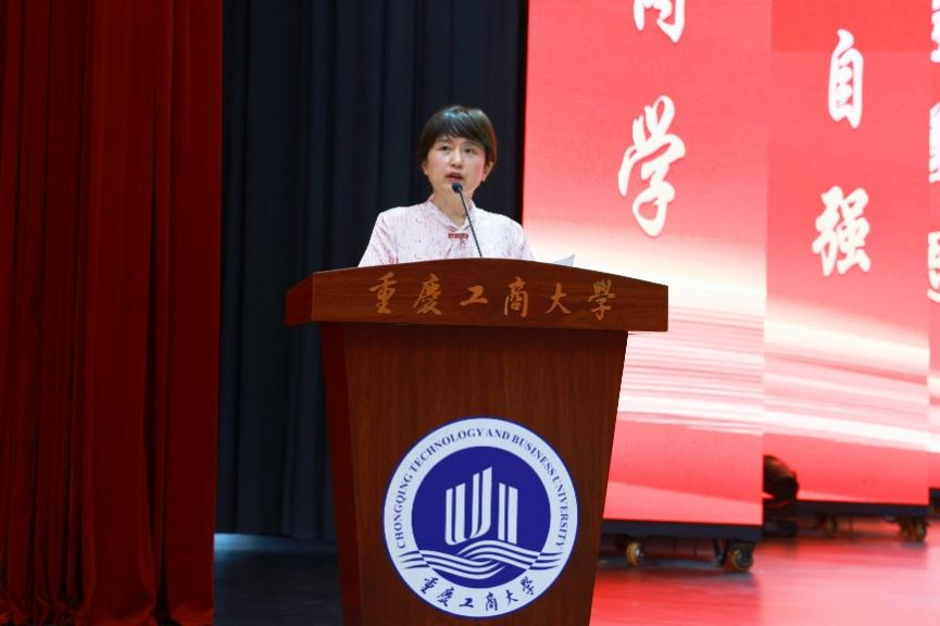 教育部高等学校物流管理与工程教指委委员、重庆市高等学校交通与物流教指委主任、9428cn太阳集团古天乐管理科学与工程学院的龚英教授代表教师发言。她首先代表全校2500余名教职工对全体新生的到来表示热烈欢迎。她用“有朋自远方来,不亦乐乎”“黄河之水天上来,奔流到海不复回”“宝剑锋从磨砺出,梅花香自苦寒来”“更无柳絮因风起,惟有葵花向日倾”四句话向全体新生送上最美好的祝福。她希望学子们始终做一朵永远向阳怒放的葵花,追逐光明、百折不挠、不卑不亢、傲然挺立。