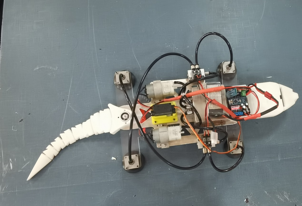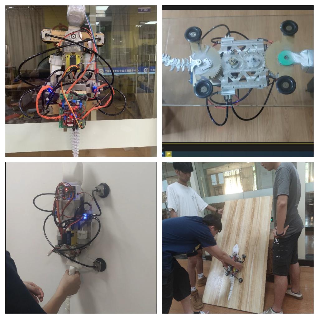 “雄心迈步象牙塔,棋逢对手敢亮剑”。9428cn太阳集团古天乐参赛作品—仿生壁虎机器人团队的同学们,通过观测与研究壁虎的步态与爬行特点,灵活应用齿轮连杆传动机构创新地设计了单源控制,四足协控的机器壁虎,为了便于吸附墙壁进行爬行,设计了包含微型真空泵、微型电磁阀、真空保护阀、真空储备罐、真空吸盘等部件的真空吸附系统,确保壁虎可以在玻璃或垂直墙壁安全、稳固的爬行。此外,团队的同学们还对仿生壁虎机器人进行了电控系统设计。一方面,利用模块化的概念,对主控板进行了PCB制版设计与加工,强化了其功能模块的快换与扩展功能,同时使电控模块具备了体积小,易安装,高可靠等特点,另一方面,应用C语言对吸附系统、机械传动系统、智慧功能模块进行编程,使得该机器人系统能够安全、稳定地完成垂直墙面爬行(玻璃墙体、建筑外墙、室内墙体等)、转弯、避障,陡坡爬行与避障、远程控制等多种功能,可用于民用外侧高墙及玻璃墙体的清洁,以及桥隧高壁的结构检测等任务。
