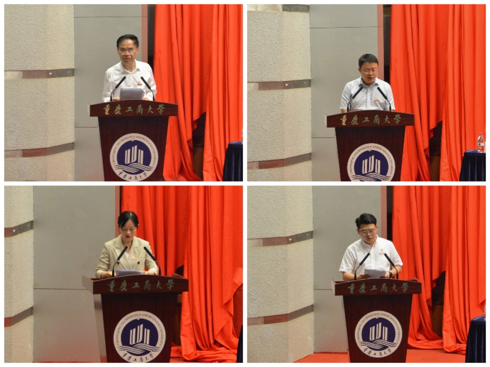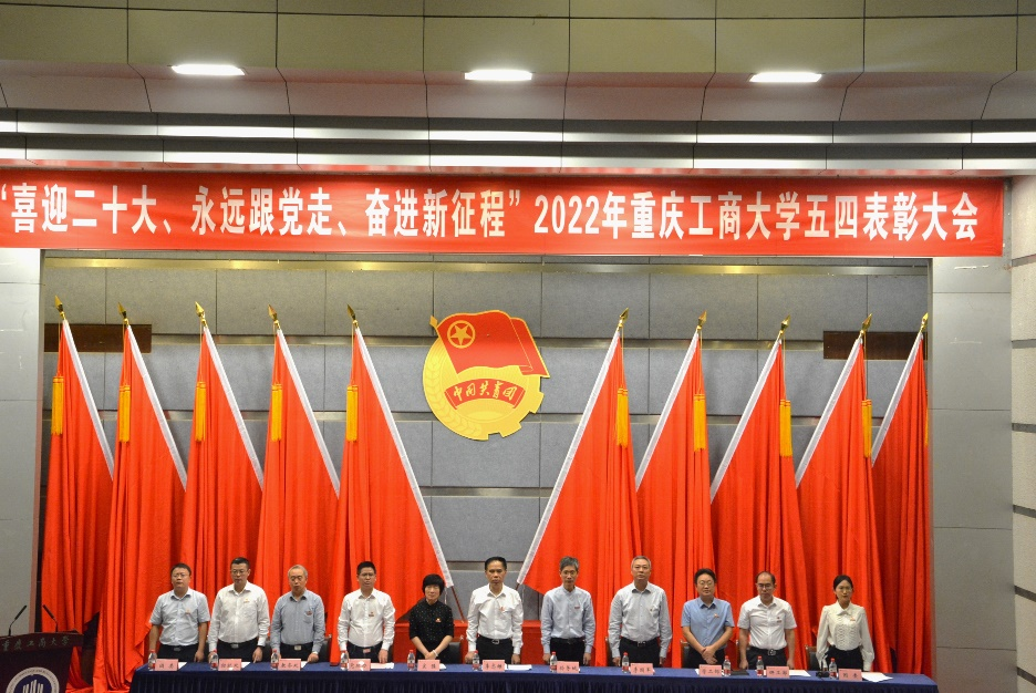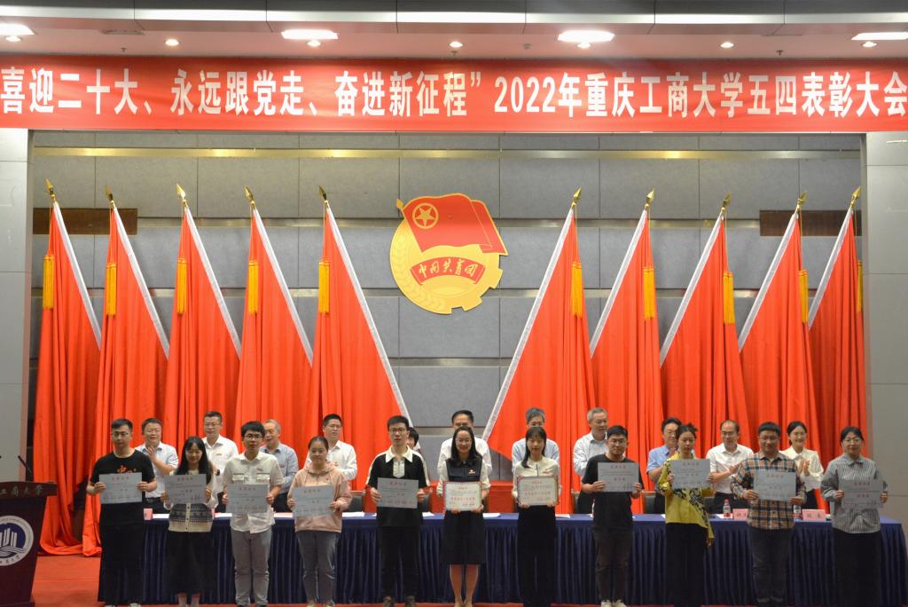 校团委书记吴佑波宣读《共青团重庆工商大学委员会关于表彰2021-2022学年先进集体和个人的决定》。领导和嘉宾为获奖集体和个人代表颁奖。五四红旗团委代表国际商学院分团委书记冯诗淇老师,共青团标兵艺术学院李中旭作了交流发言。随后,全场师生齐唱团歌,五四表彰大会圆满结束。