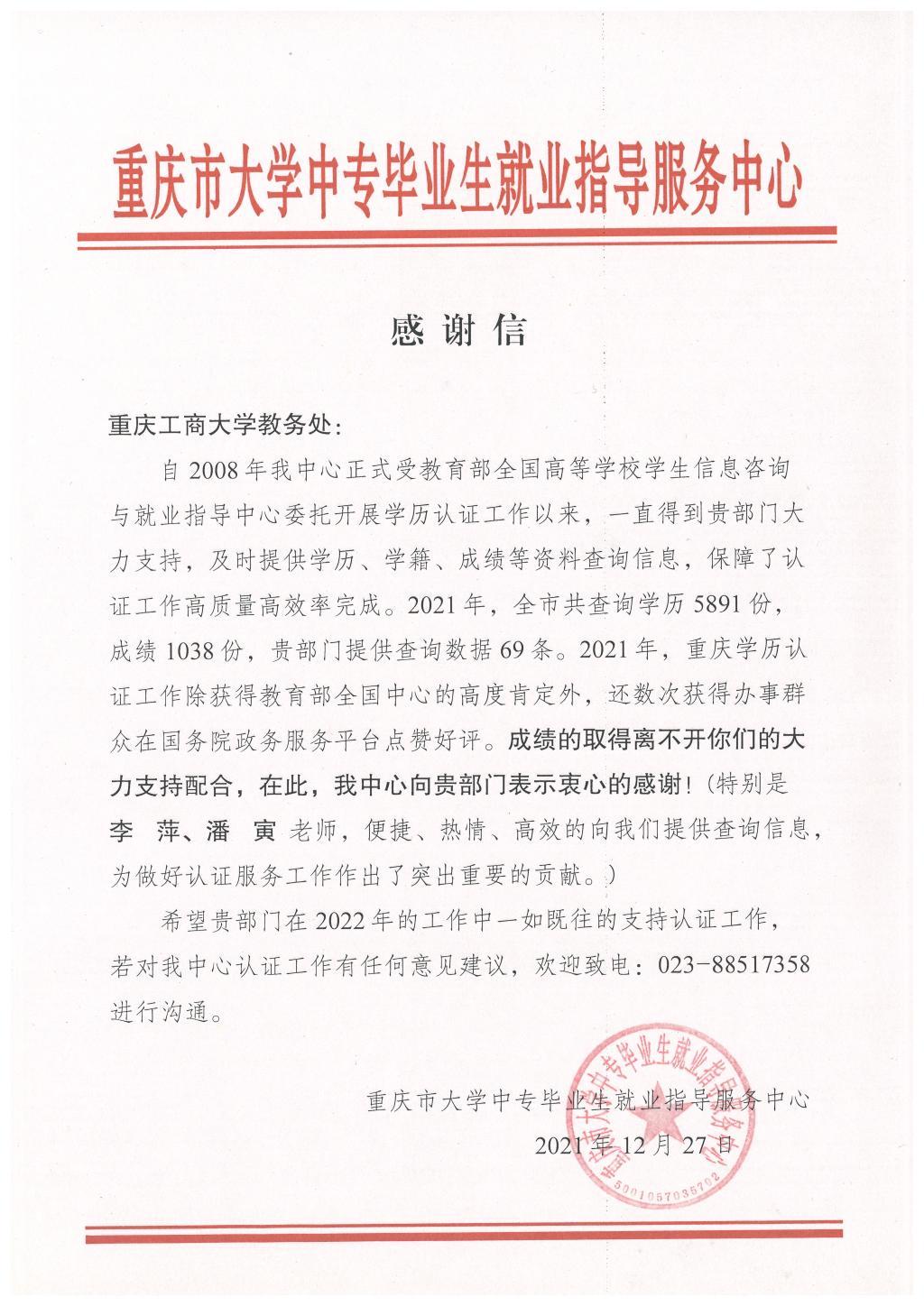 近日,重庆市大学中专毕业生就业指导服务中心向9428cn太阳集团古天乐教务处发来感谢信,对9428cn太阳集团古天乐在2021年的学籍管理工作和相关教师作出肯定和表扬。学校学籍管理工作人员常年为校友提供学历、学籍、成绩等方面的服务,得到了相关部门和广大校友的肯定。