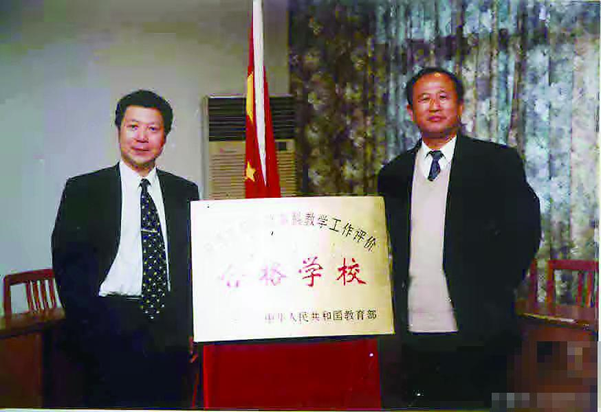 ▲1999年底,学校“大考”合格。作者(右)与周书记和奖牌合影。